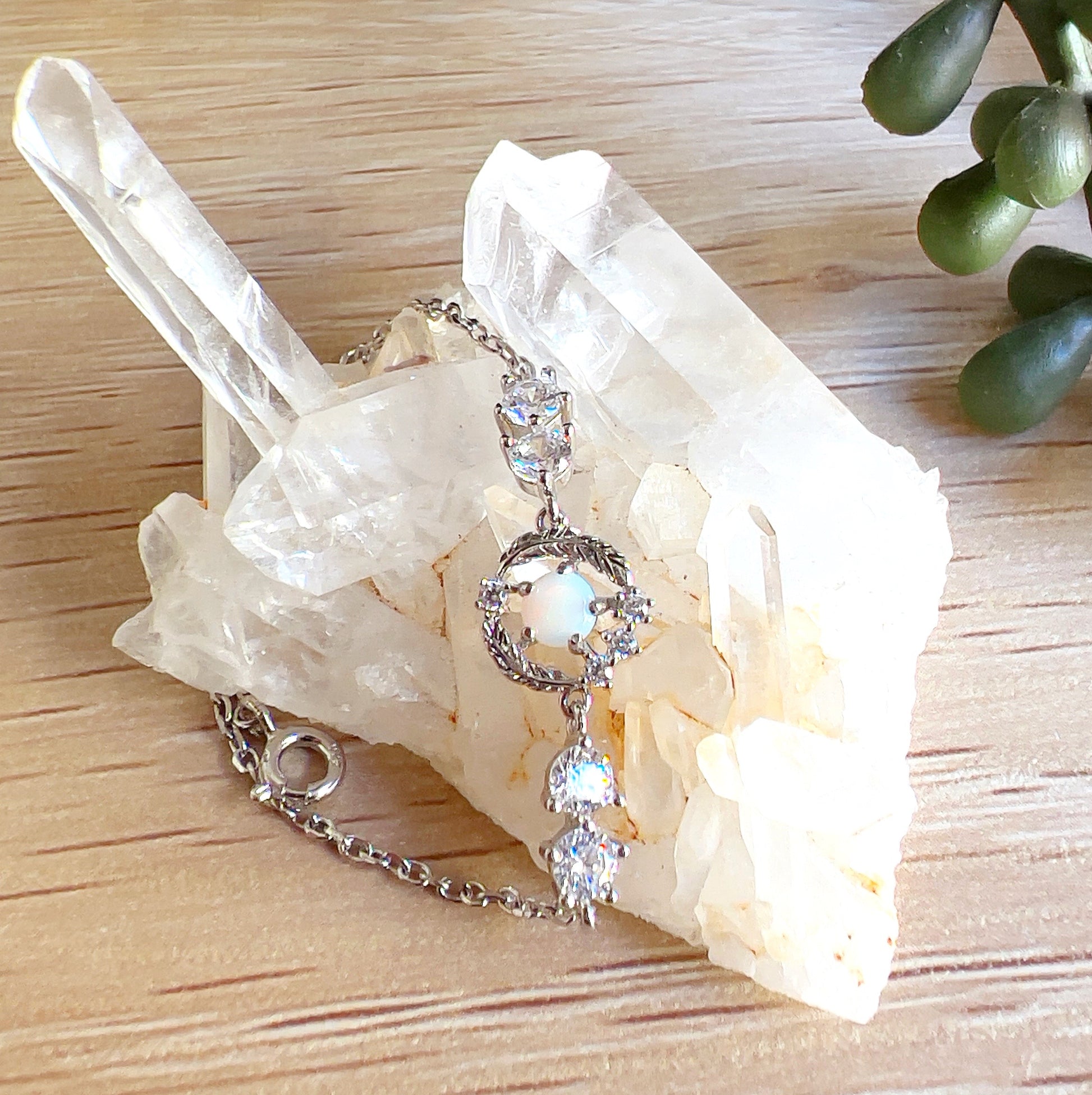 Delicate and divine, this sterling silver bracelet features an ethereal feather design cradling a luminous Australian white opal at its heart. Accented with sparkling cubic zirconia, it shimmers with a soft elegance-like moonlight brushing across your wrist. Lightweight and fluid, this piece is designed to be worn as a daily reminder of intuition, transformation, and gentle guidance from the spiritual realms.